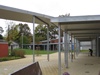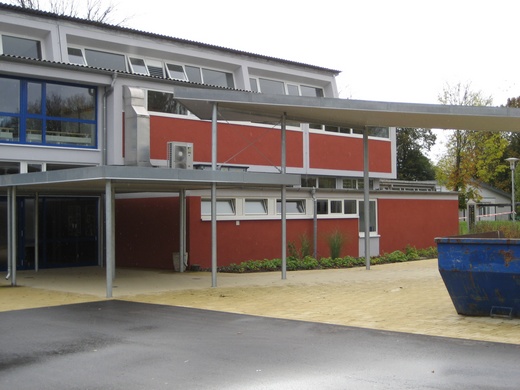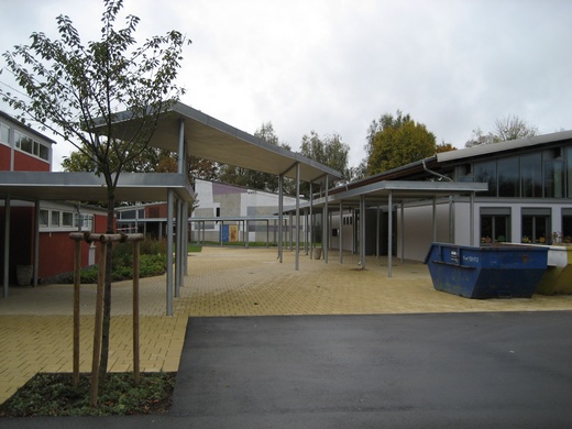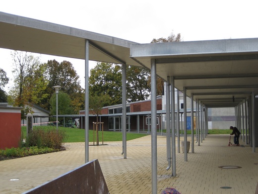 Die quer im Schulhof stehende, hohe Dachkonstruktion ermöglicht eine